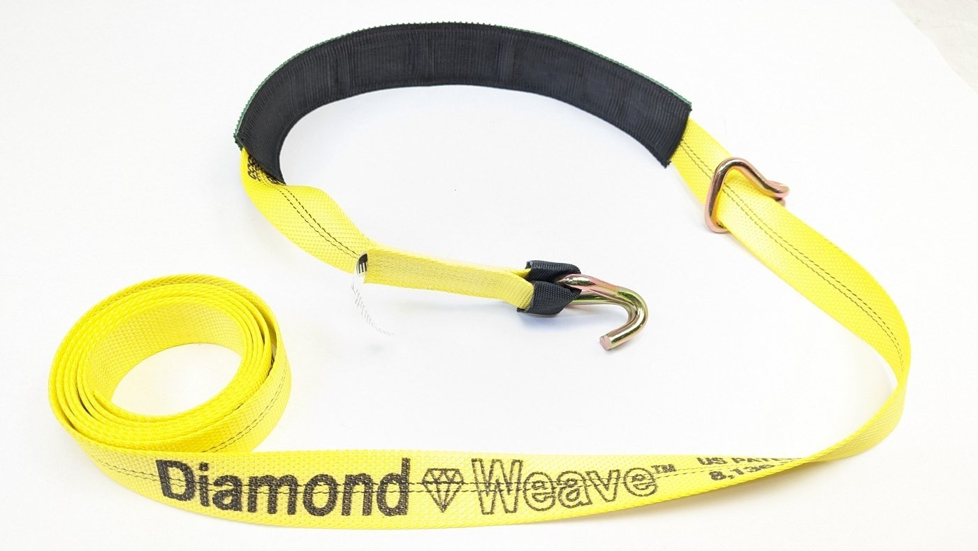 Features two 13,200 lb break strength wire hooks plus low profile tread grab sleeve woven and stitched in the USA out of the new 14,000 lb Diamond Weave™ webbing, with a 2 ft Low-Profile tire grip sleeve. No ratchet handle included.