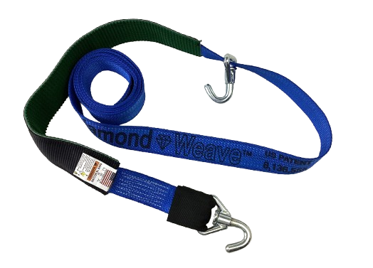 Small Welded Swivel-J hook Premium Diamond Weave™ webbing low profile grip sleeve wheel strap. Made for trailers like newer Boydstuns. 2400 lbs WLL (working load limit).